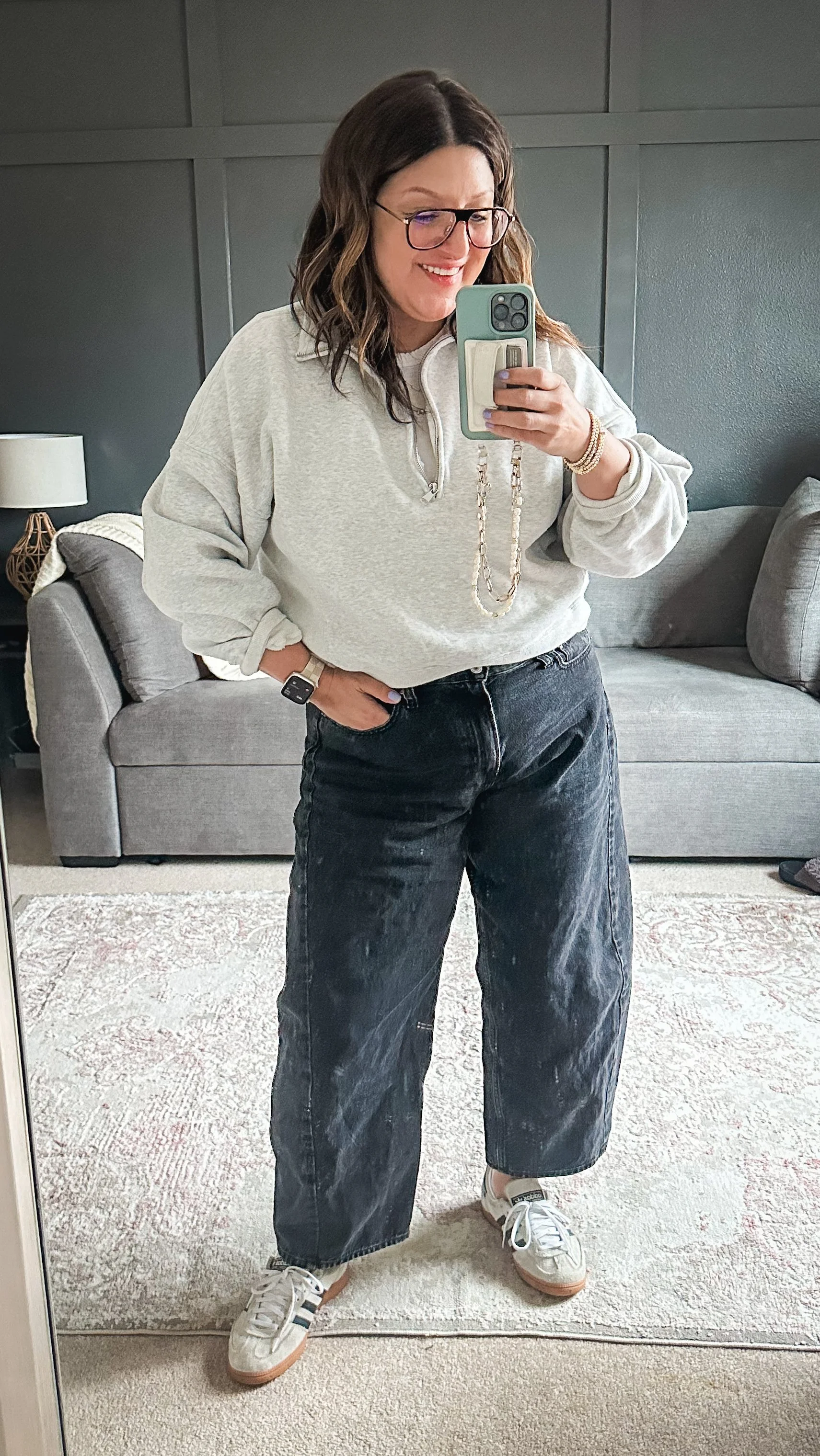 Outfit: Abercrombie quarter zip sweatshirt, Abercrombie barrel-leg jeans, Adidas sneakers