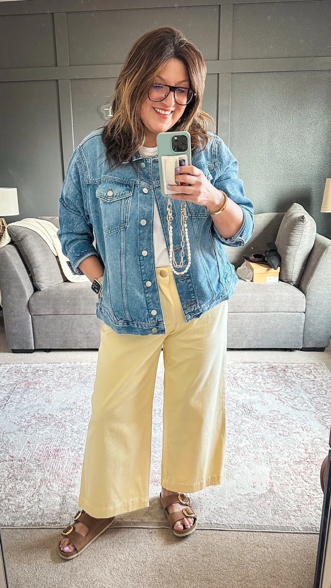 Daytime Outfit: Butter yellow Wit & Wisdom pants, plain white tee, Big Buckle Birkenstocks, relaxed-fit denim jacket from Gap Factory