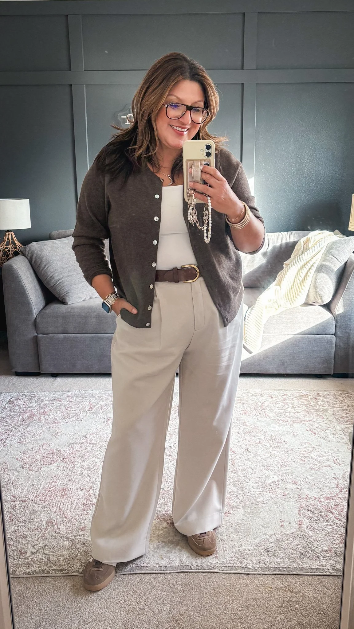 Outfit: Quince cardigan layered over a Spanx camisole, Abercrombie Sloan wide-leg trousers, and brown Adidas sneakers