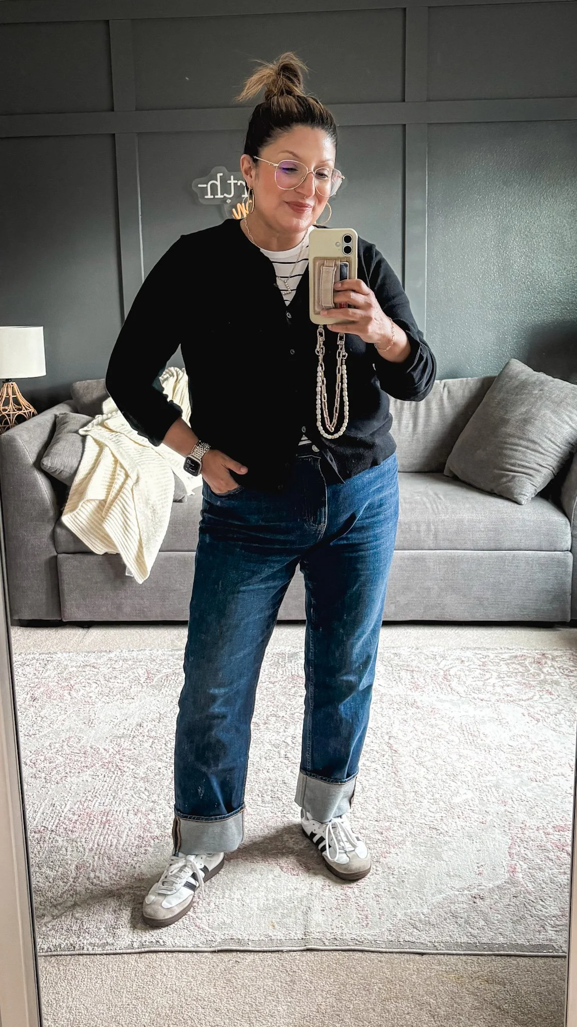Outfit: Gap Factory cardigan over a black-and-white striped shirt, new-to-me Gap Factory 90 straight cuffed jeans, and white Adidas Sambas with black stripes.