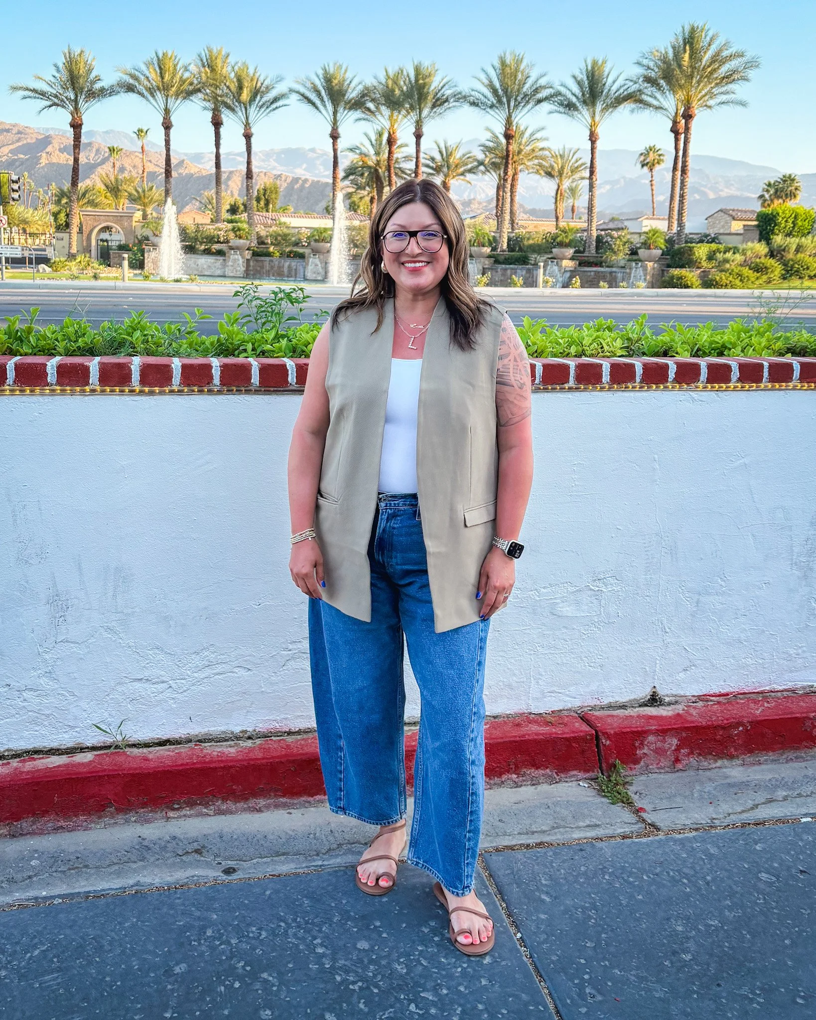 I wore a new-to-me long sleeveless vest from Open Edit layered over a Spanx cami (because smoothing is self-care), with my blue Abercrombie barrel leg jeans and some strappy flat sandals—cute enough to dance in, comfy enough to commit.