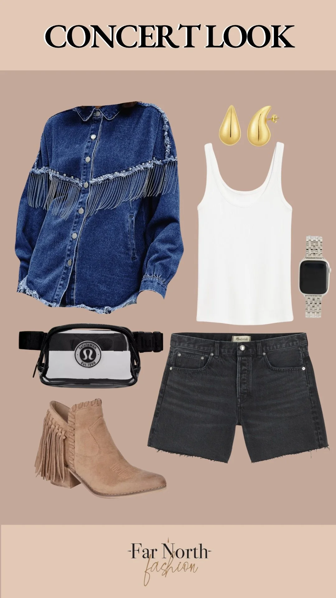 Outfit planning is in full swing — I’m thinking black denim shorts, a tank, fringe booties, and an oversized denim fringe jacket I just ordered.
